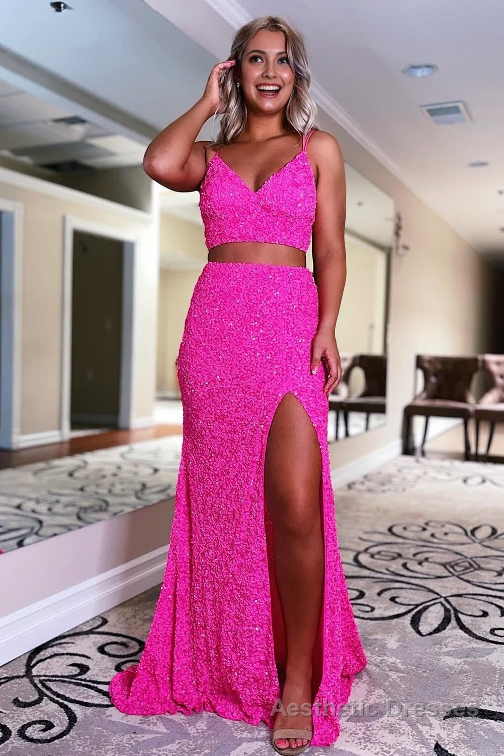 Two Piece Orange Sequins Mermaid Prom Dress with Slit