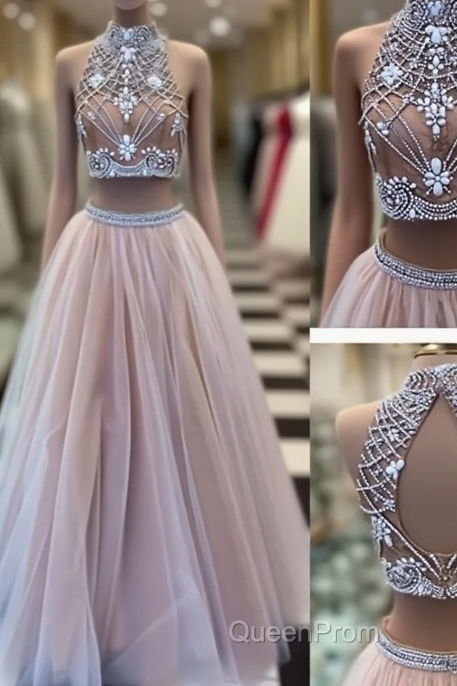 Two Pieces High-Neck Beaded Tulle Long Champagne Evening Prom Dresses, Evening Dresses