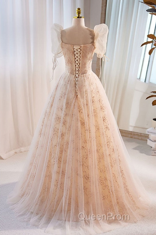Unique And Beautiful Champagne Sequin Square Neck Fluffy Short Sleeved Ball Dresses Champagne A-Shaped Princess Backless Strap And Floor Length Evening Dresses