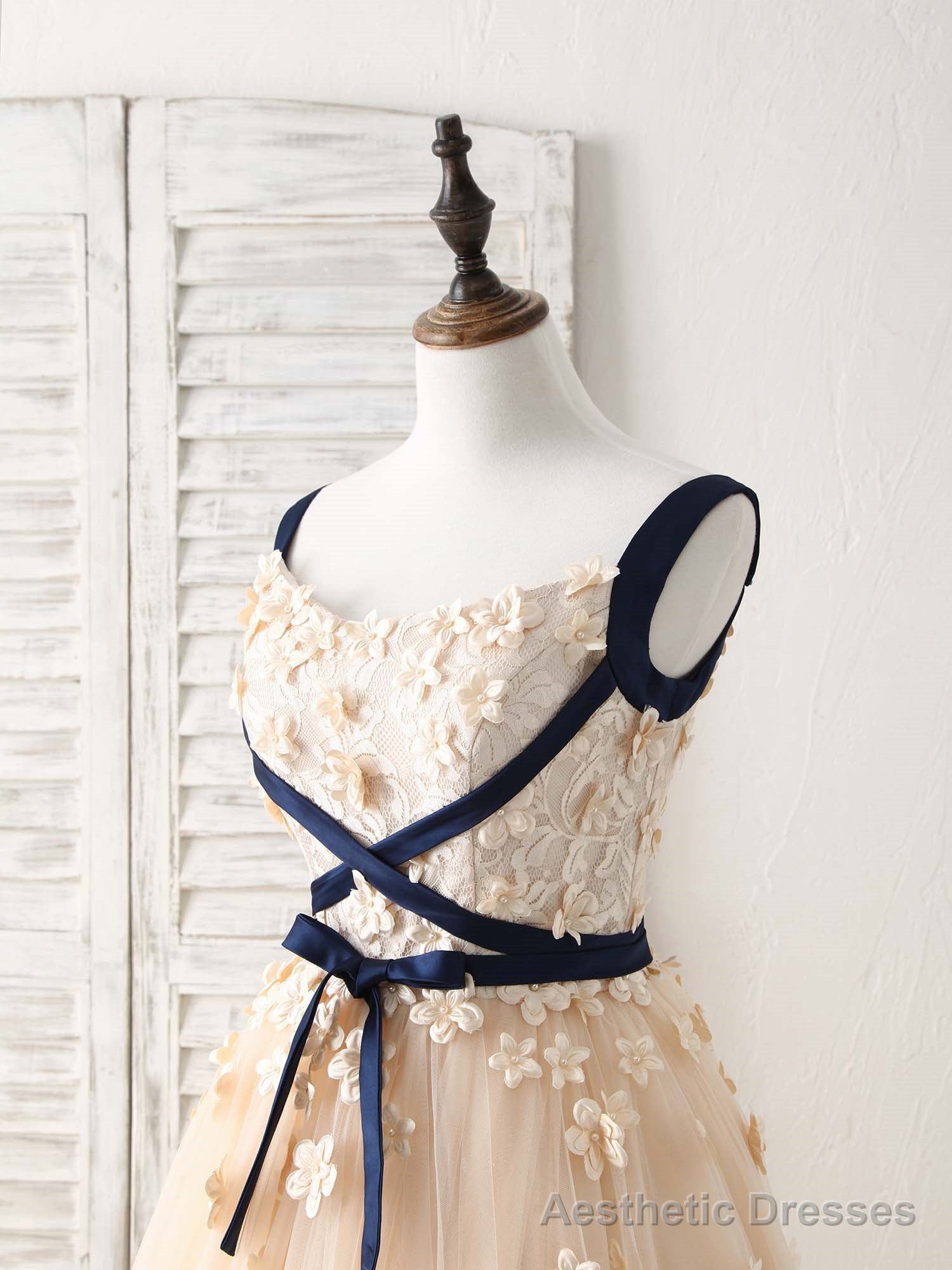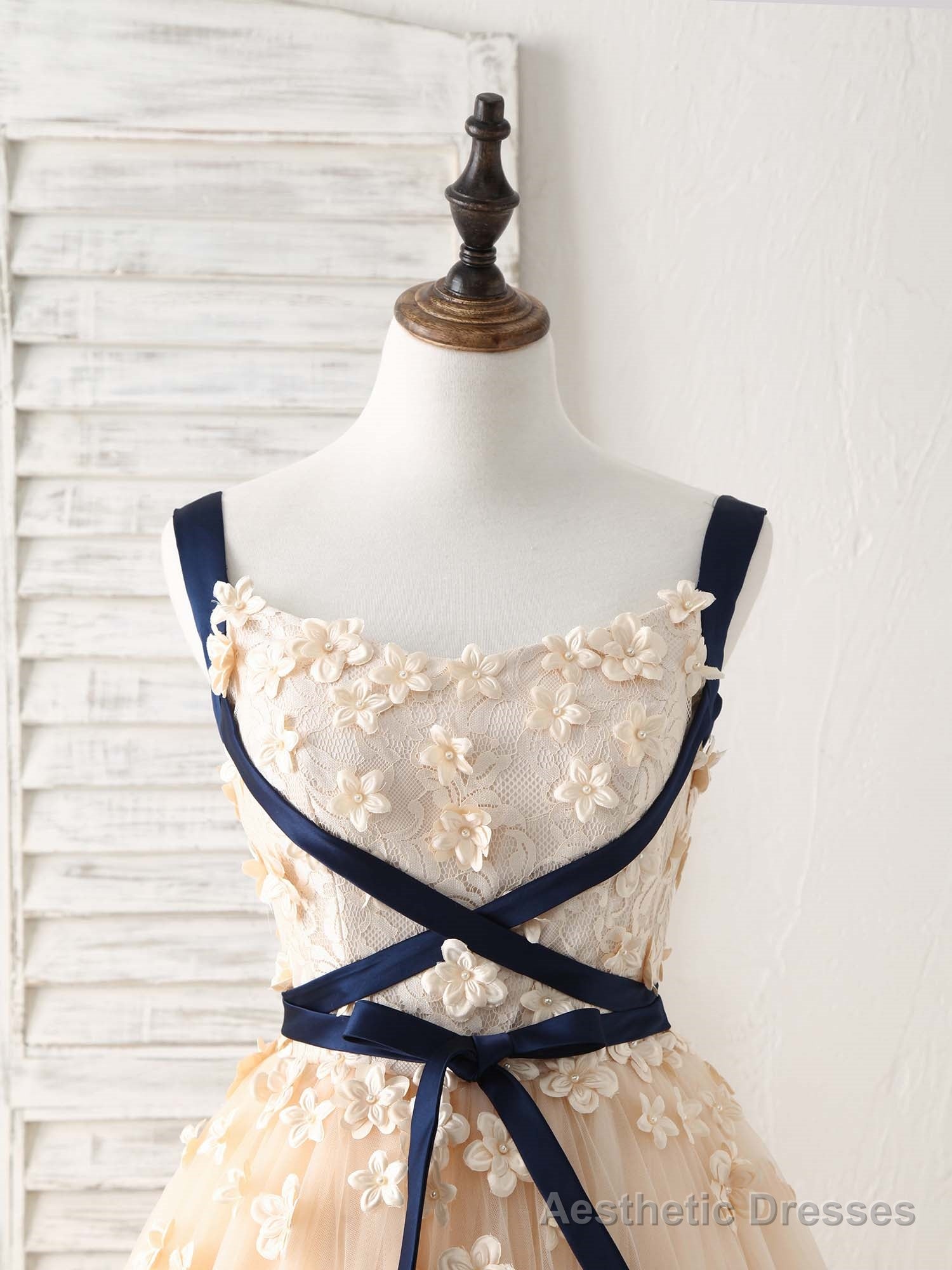 Unique Champagne Lace Tulle Long Prom Dress, Champagne Evening