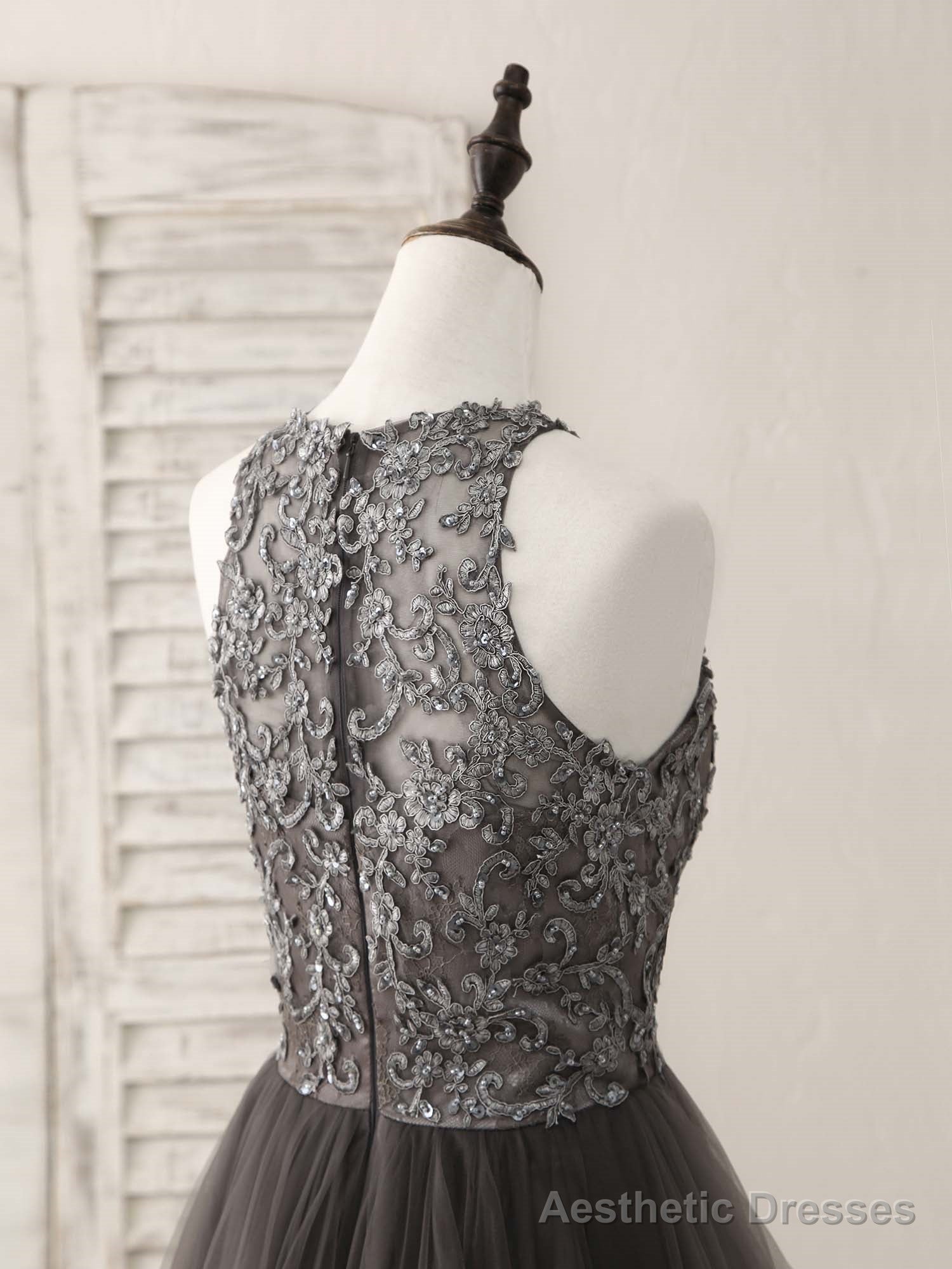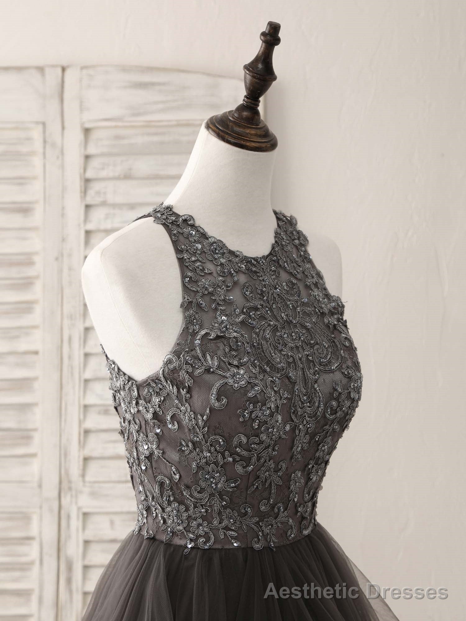 Unique Round Neck Lace Applique Tulle Long Prom Dresses