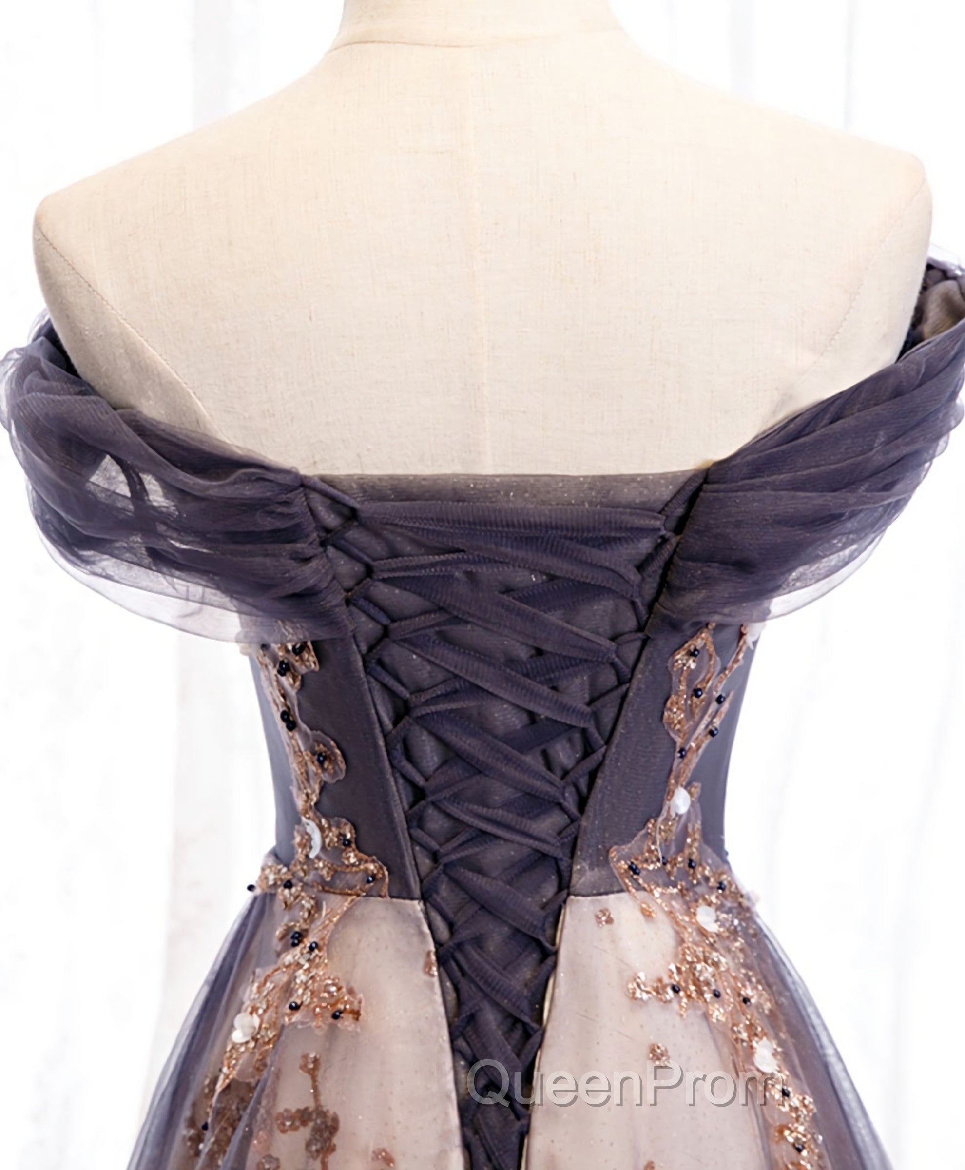 Unique Tulle Off Shoulder Lace Long Evening Prom Dresses, Lace Formal Dresses