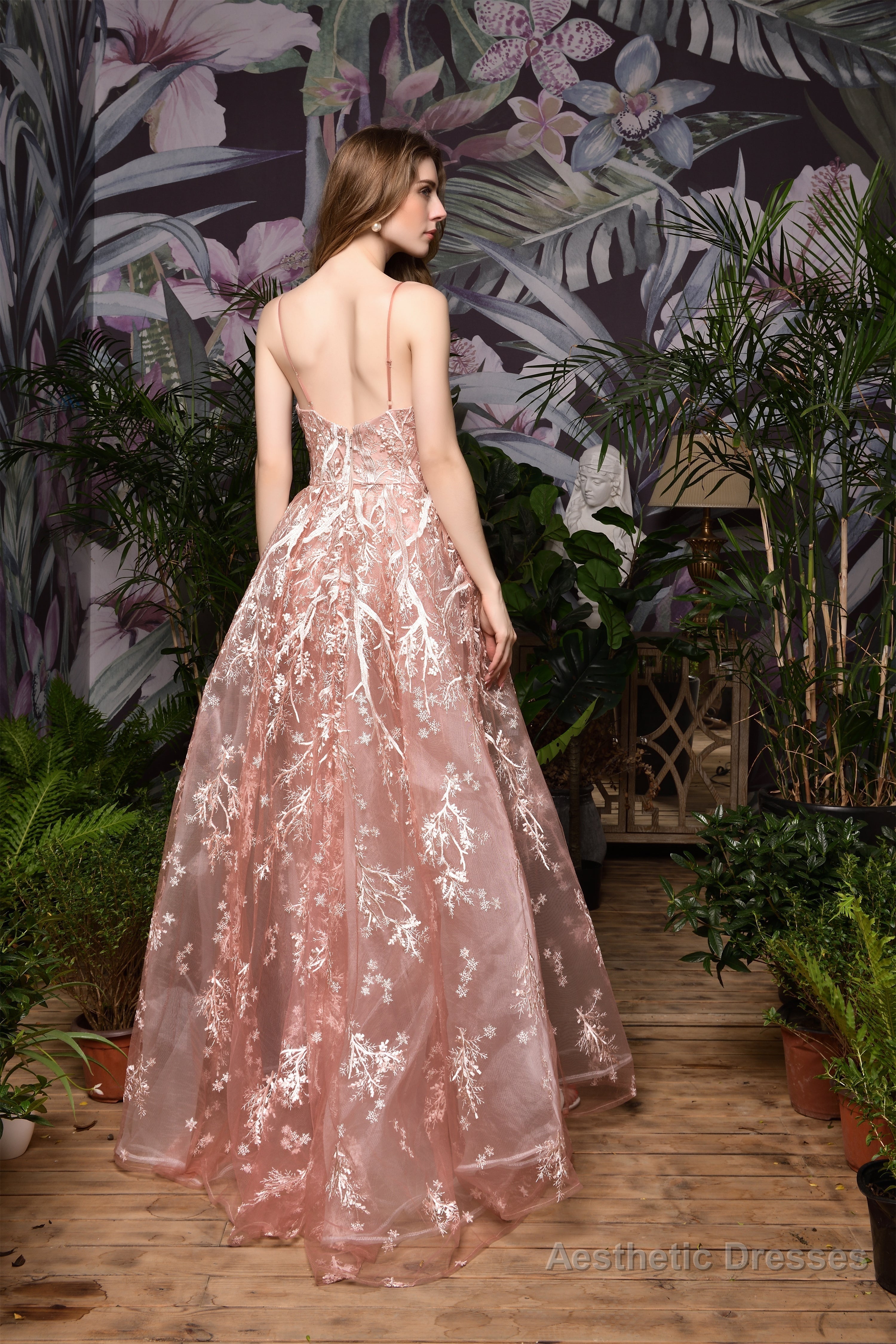 V Neck Lace Spaghetti Straps Vintage Lace A Line Long Prom Dresses