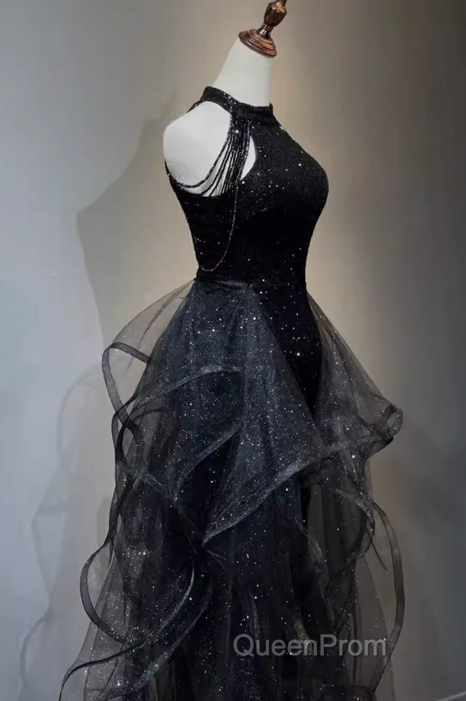 Vintage A Line Halter Black Party Dresses Sequin Evening Prom Dresses