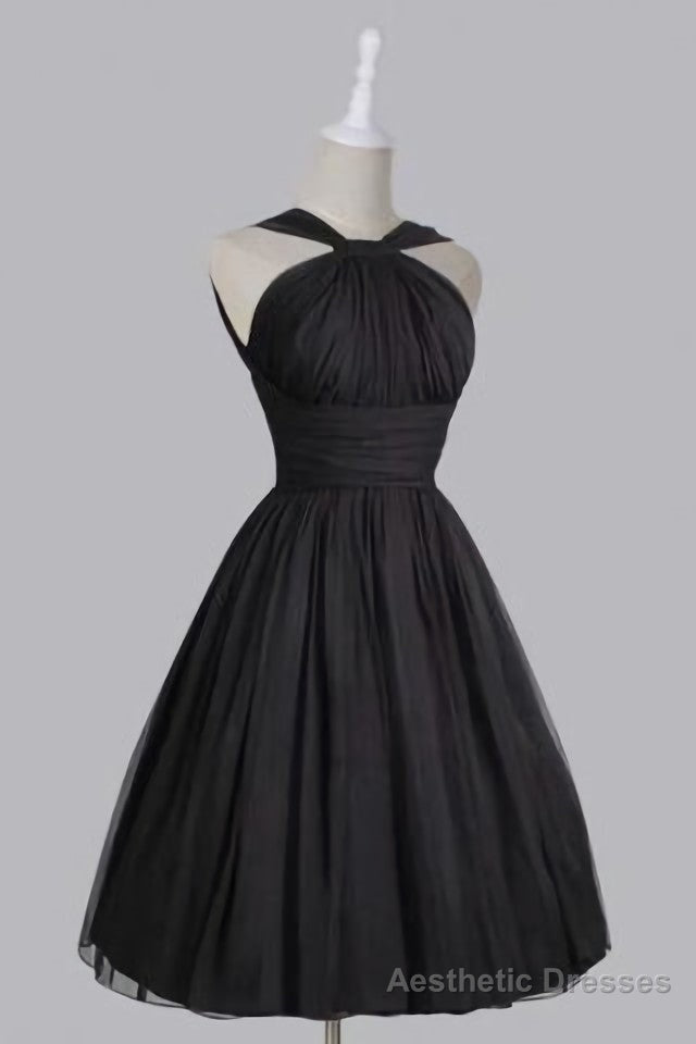 Vintage A Line Straps Knee Length Chiffon Sash Backless Black Party Homecoming Dresses