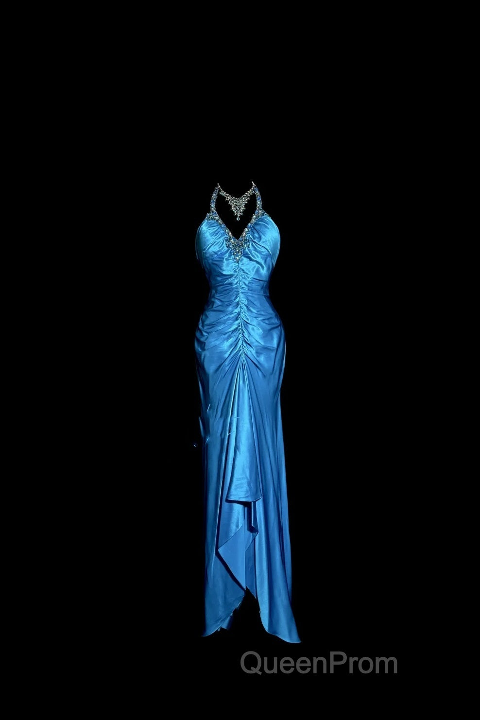 Vintage Mermaid Halter Neck Royal Blue Satin Backless Evening Prom Gown Fairy Evening Prom Dresses