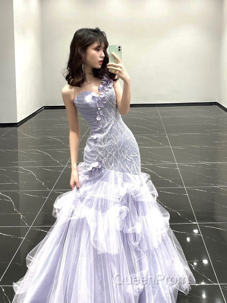 Vintage Mermaid One Shoulder Lilac Tulle Satin Long Evening Prom Dresses Party Dresses
