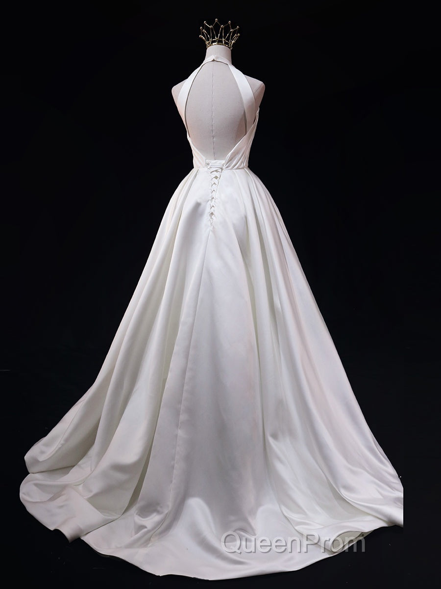 White Halter Simple Satin Backless Long Weddign Party Dresses, White Long Formal Dresses