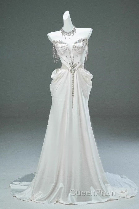 White Satin A-Line Sweetheart Beaded Long Evening Prom Dresses, Elegant Adult Ceremony Graduation Evening Prom Dresses