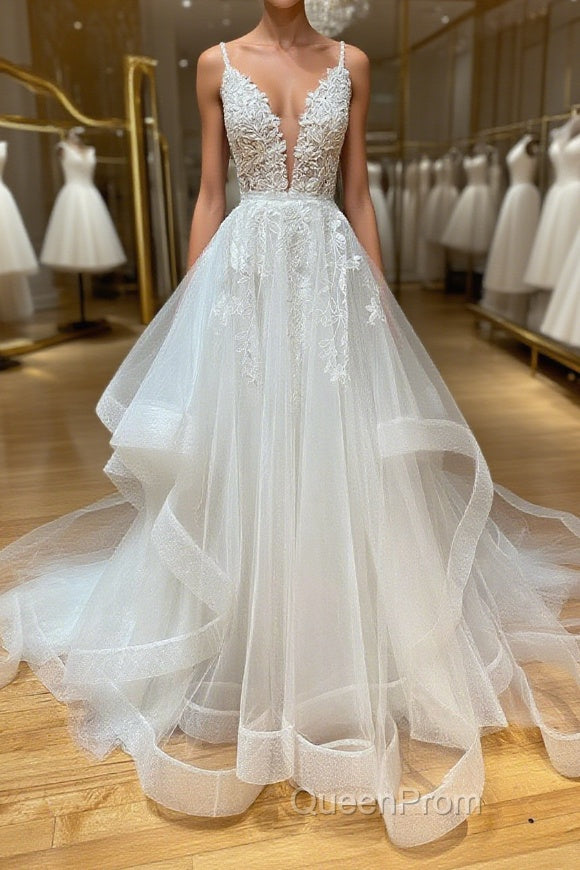 White v neck tulle lace long Evening Prom Dresses, white lace formal Dresses
