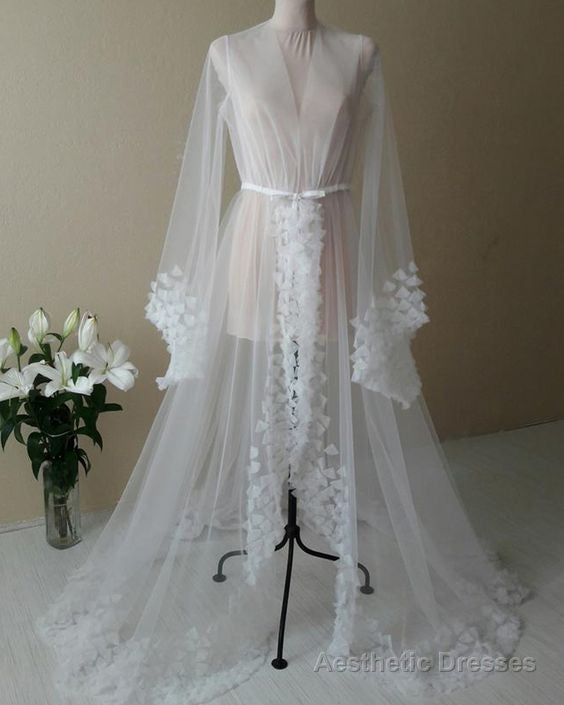 white v neck tulle long sleeved bridal boudoir robe with 3d flowers