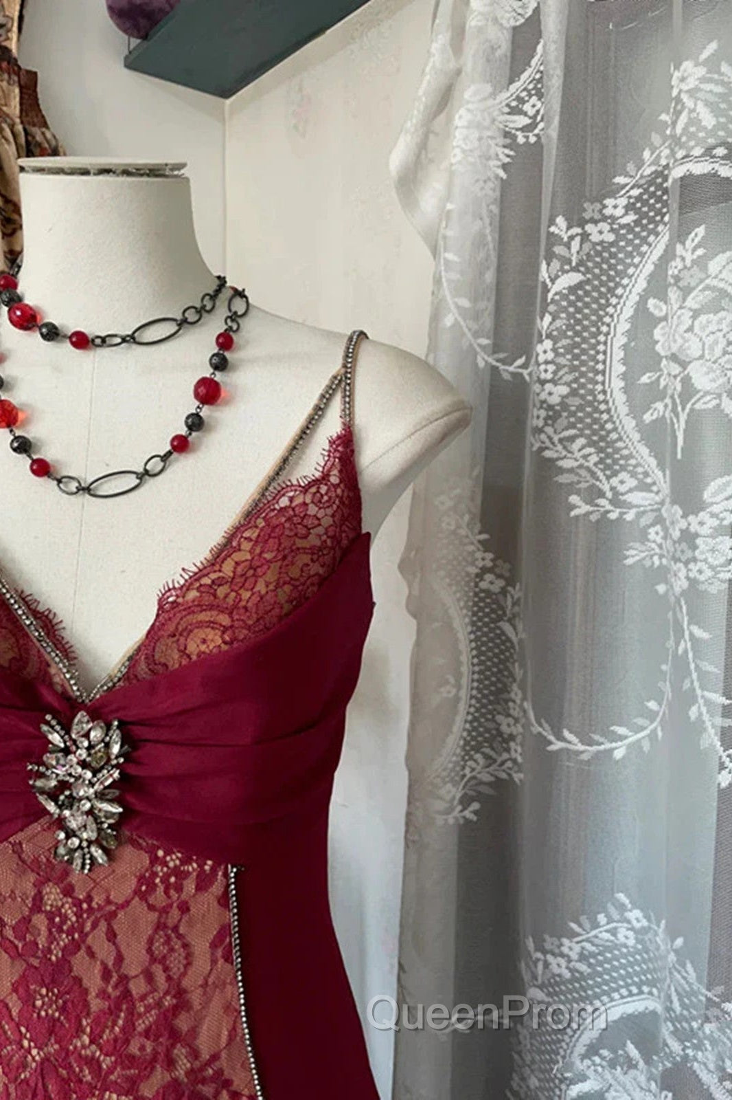 Wine Red Mermaid Straps Sweetheart Party Dresses, Wine Red Lace Evening Prom Dresses