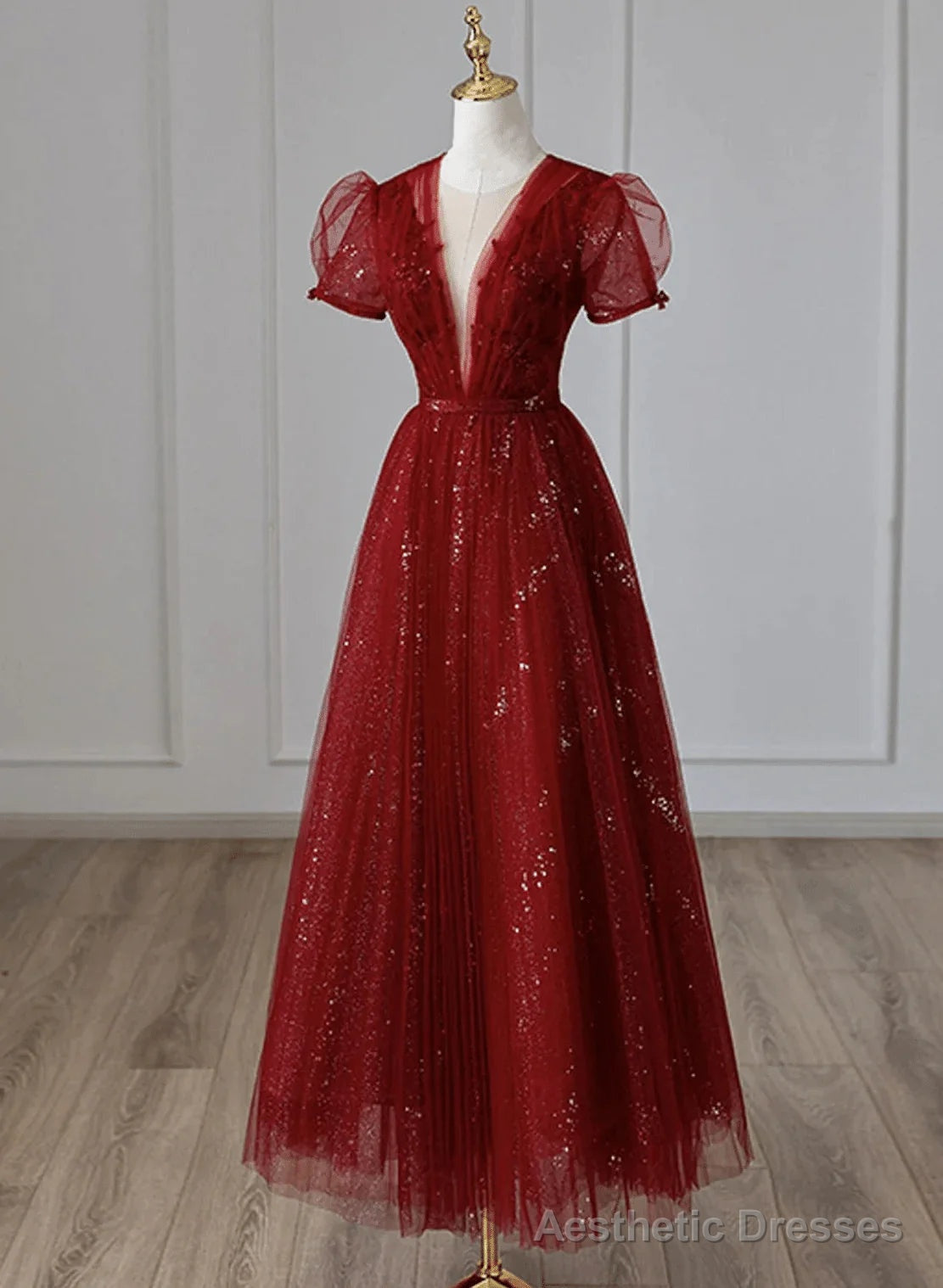 Wine Red Tulle Short Sleeves Long Party Dress Wine Red Evening Gown prom dresses shops