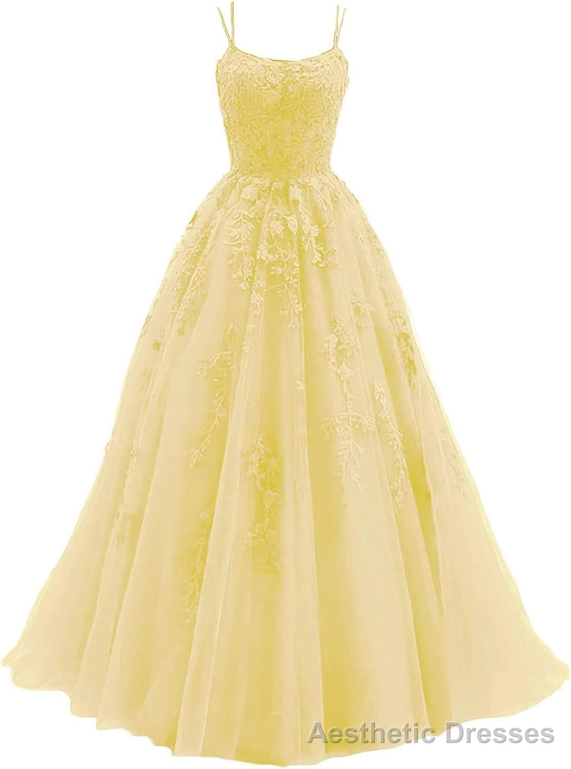 Womens Lace Appliques Prom Dresses Long Spaghetti Strap Ball Gowns Tulle Formal Dress for Party