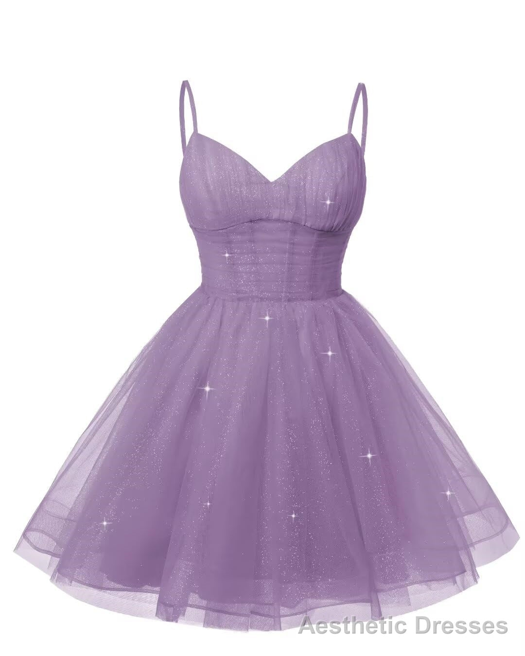 Womens V Neck Tulle Spaghetti Straps Wisteria Homecoming Dresses with Corset Back Short Prom Gowns for Teens