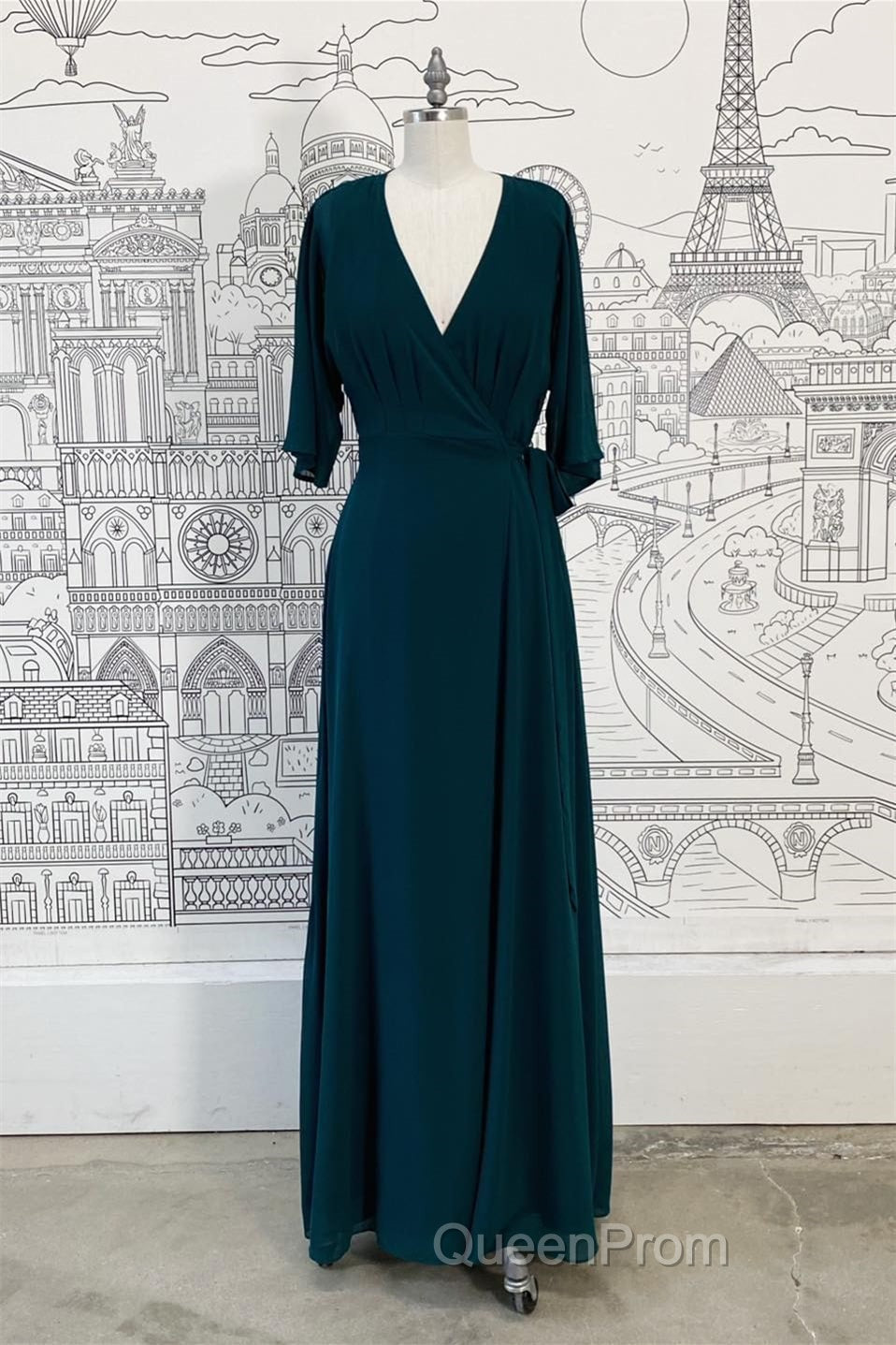 Wrap V Neck Sleeves Chiffon Long Bridesmaid Dresses with Sash