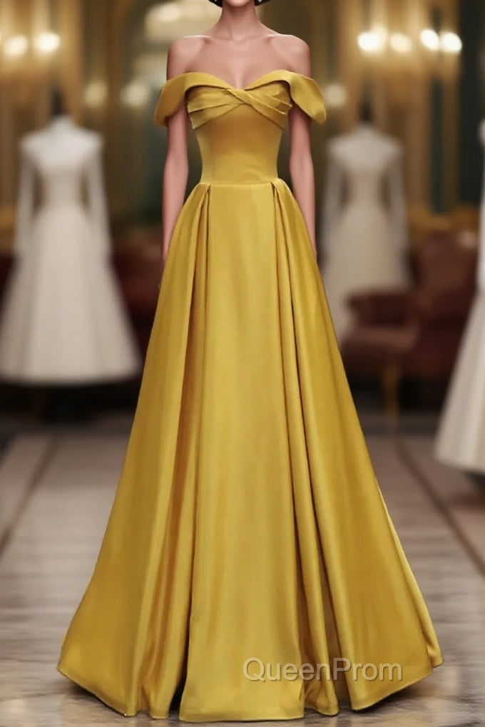Yellow A-Line Simple Satin Off Shoulder Evening Prom Dresses, Yellow Satin Formal Dresses