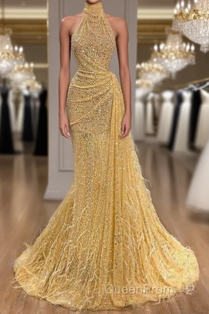 Yellow Evening Dresses Long High Neck Sparkly Feather Luxury Bling Evening Gown Formal Evening Prom Dresses